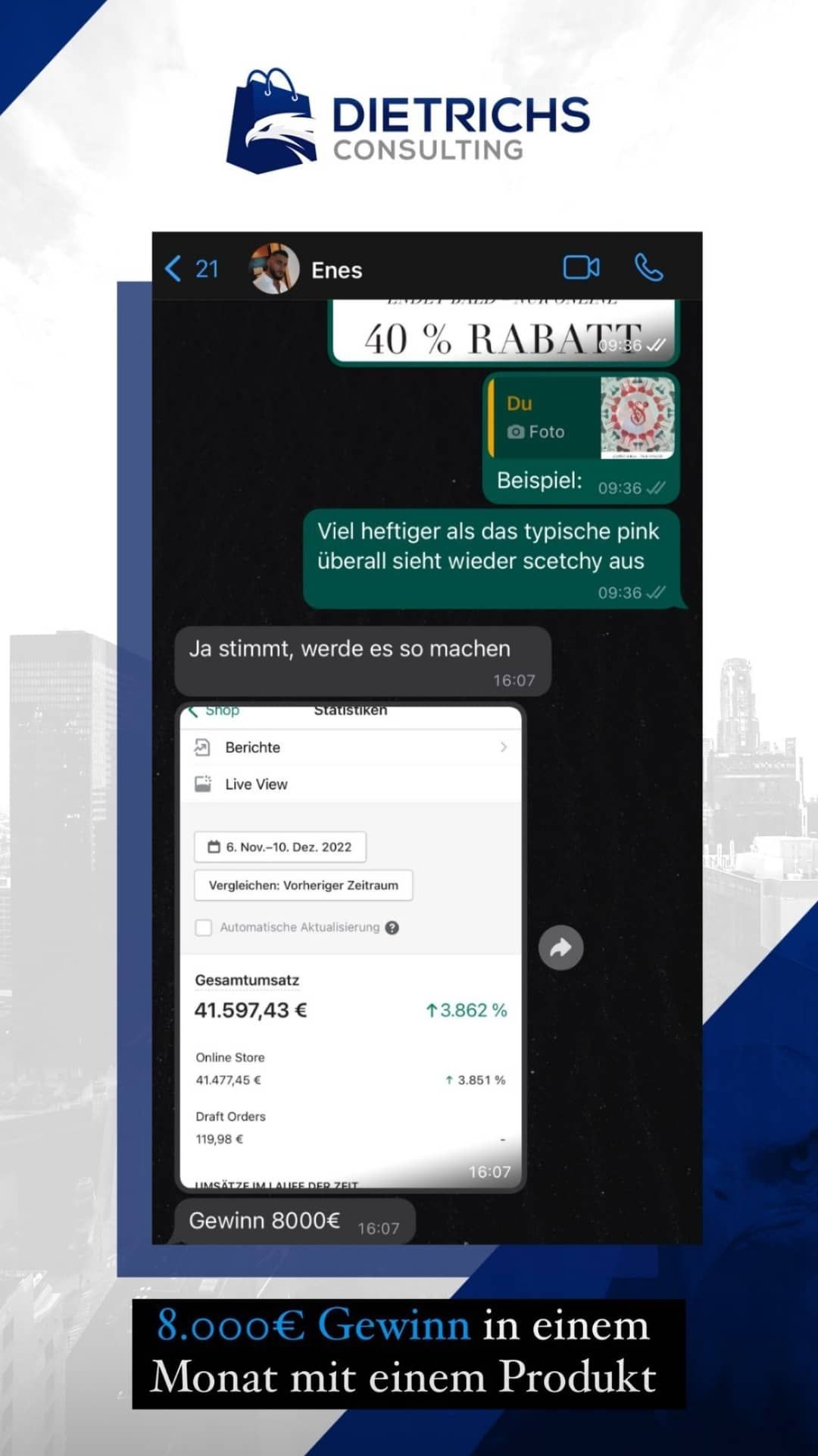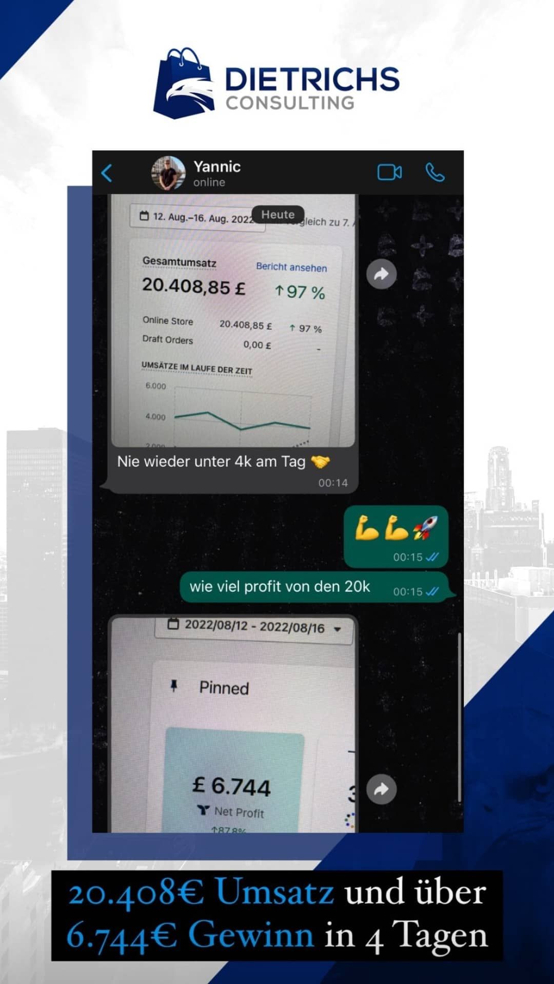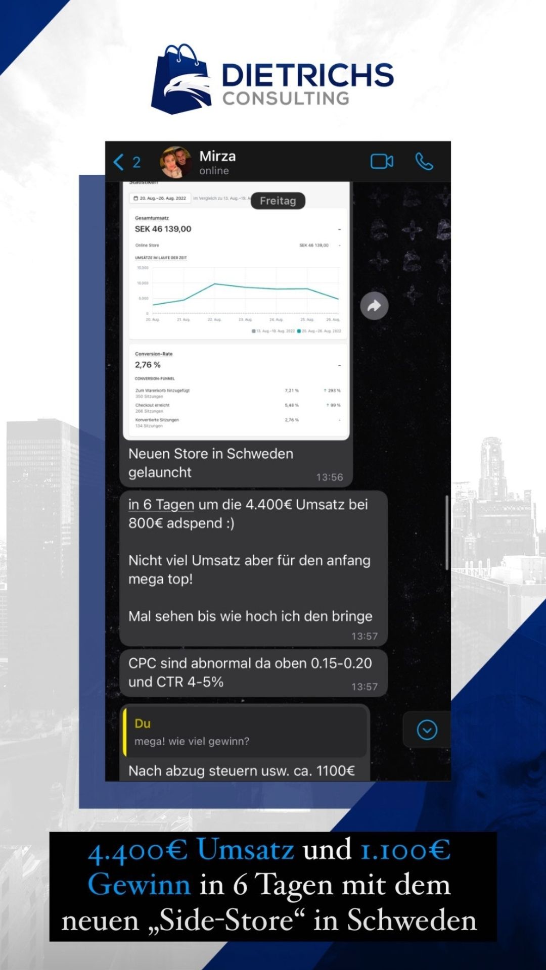 “Ich war auf der Suche nach einem Dropshipping Coach. Andere Coaches haben regelmäßig dieselben Kundenergebnisse gepostet, wobei Mik’s eigene Erfolge und die Vielzahl an Kundenergebnisse im Dropshipping der Grund waren, warum ich mich für ein Coaching bei ihm entschieden habe”