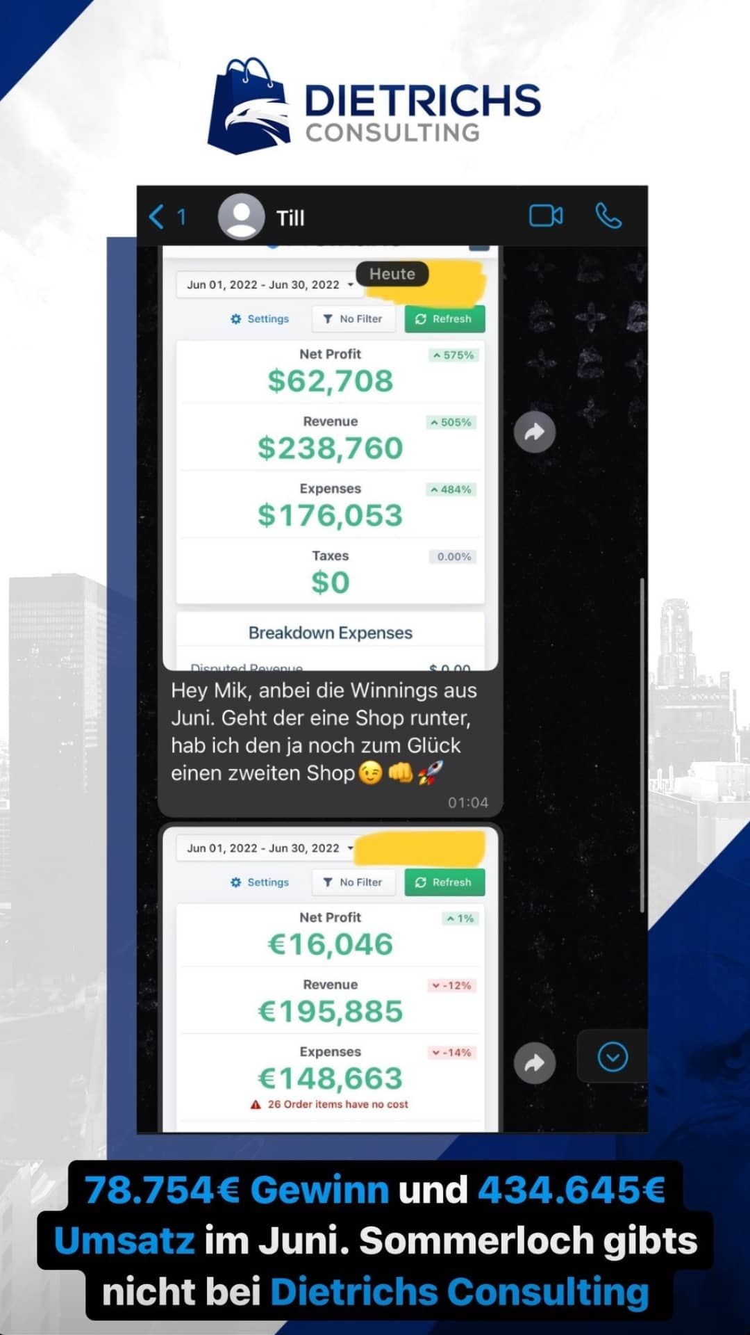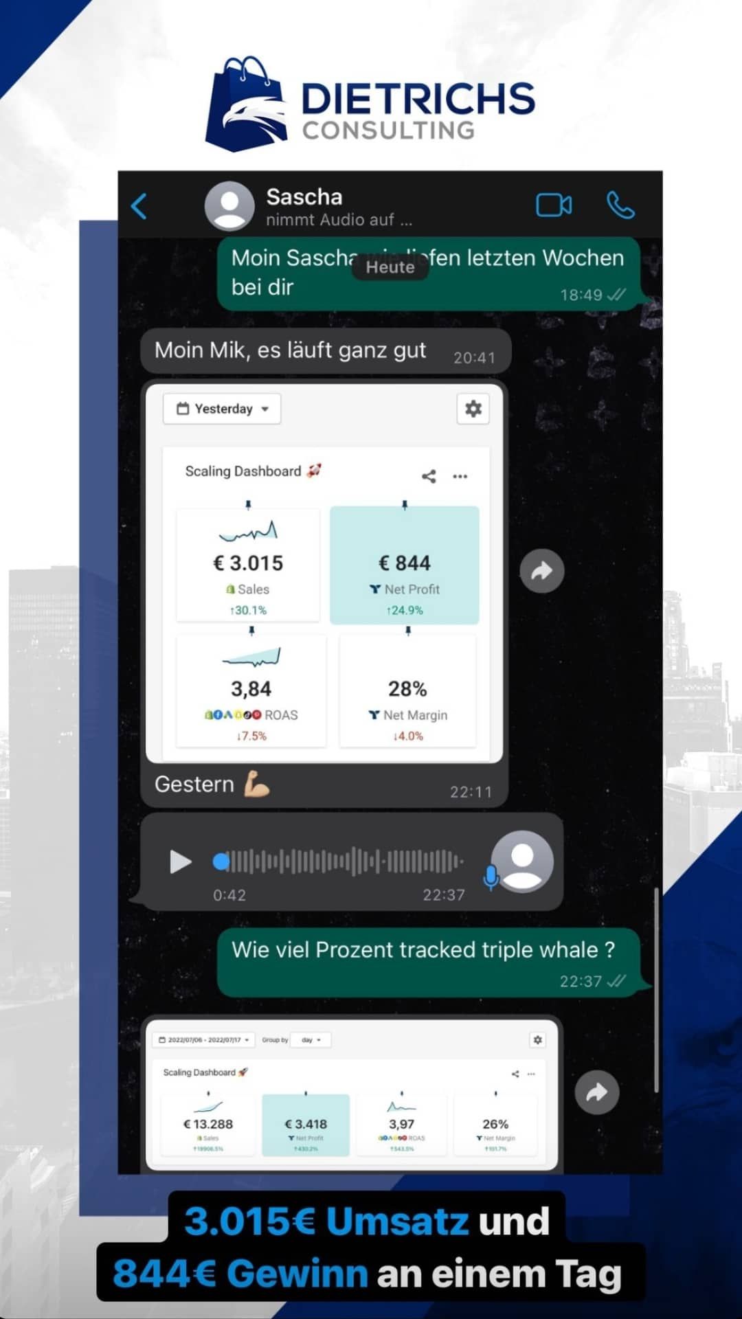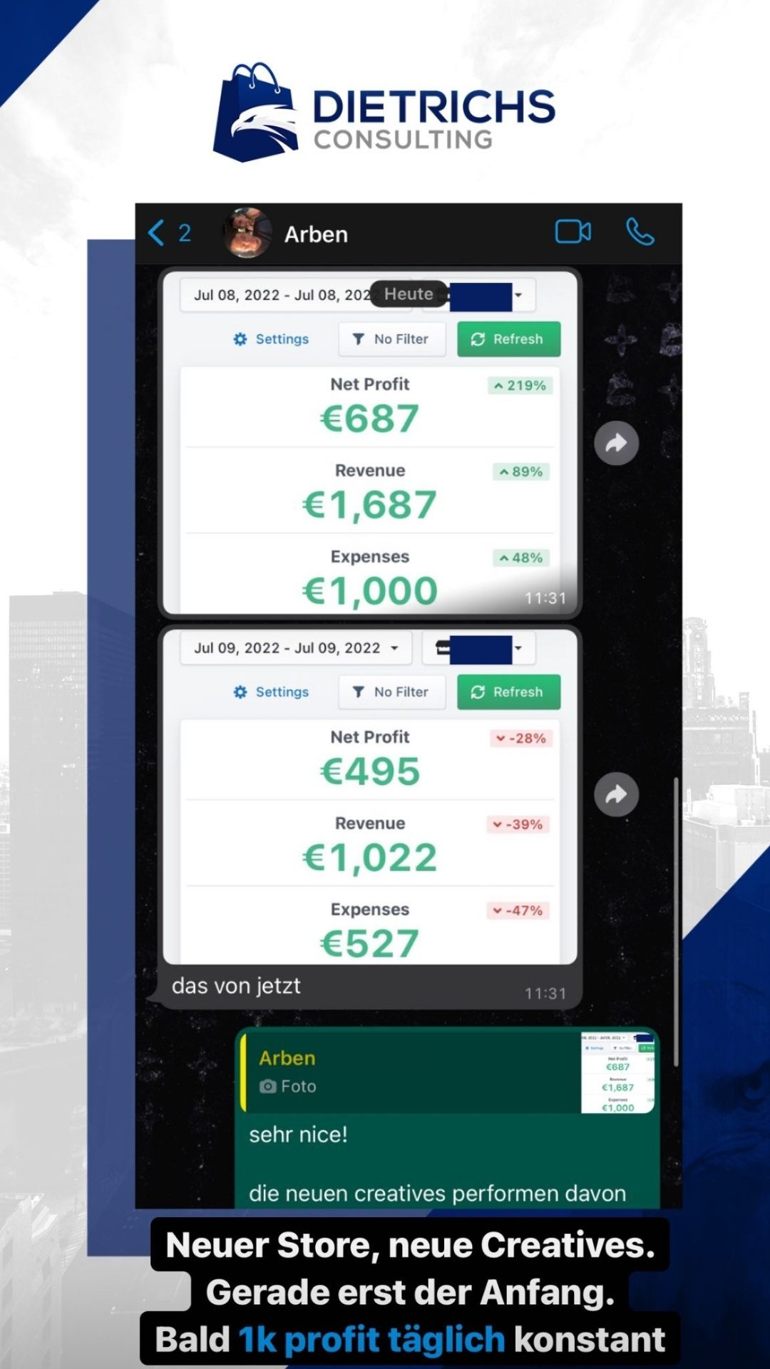 “Ich war auf der Suche nach einem Dropshipping Coach. Andere Coaches haben regelmäßig dieselben Kundenergebnisse gepostet, wobei Mik’s eigene Erfolge und die Vielzahl an Kundenergebnisse im Dropshipping der Grund waren, warum ich mich für ein Coaching bei ihm entschieden habe”